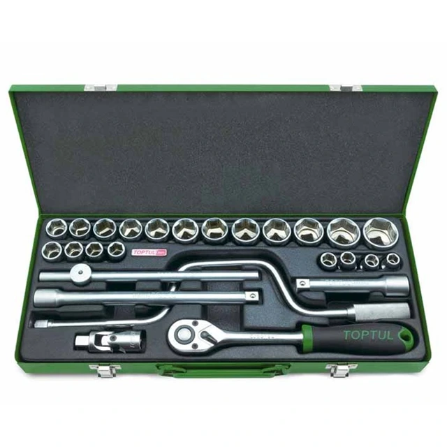 - 20 عدد سوکت بکس با درایو 1/2 اینچ در سایز های 10، 11، 12، 13، 14، 15، 17، 16، 18، 19، 20، 21، 22، 22، 24، 25، 26، 27، 30، 32 میلیمتر