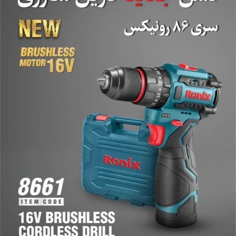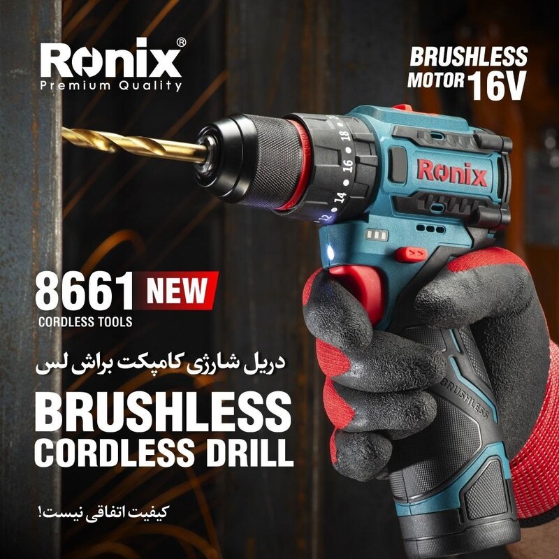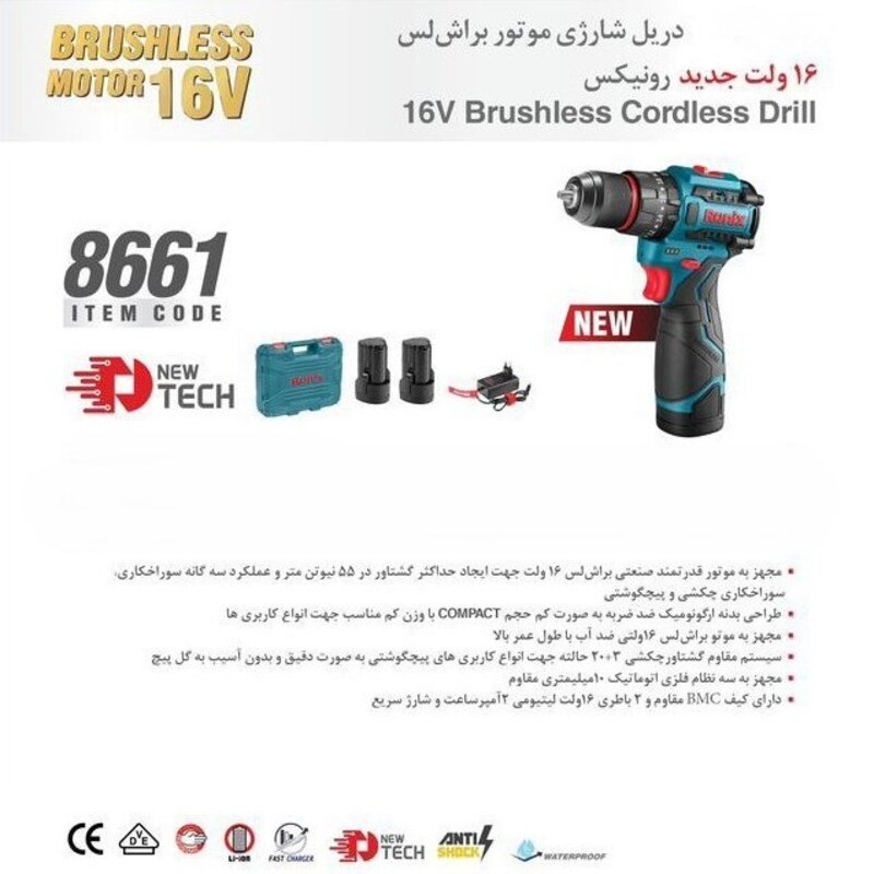 ویژگیهای دریل چکشی شارژی براشلس 16 ولت رونیکس مدل 8661: