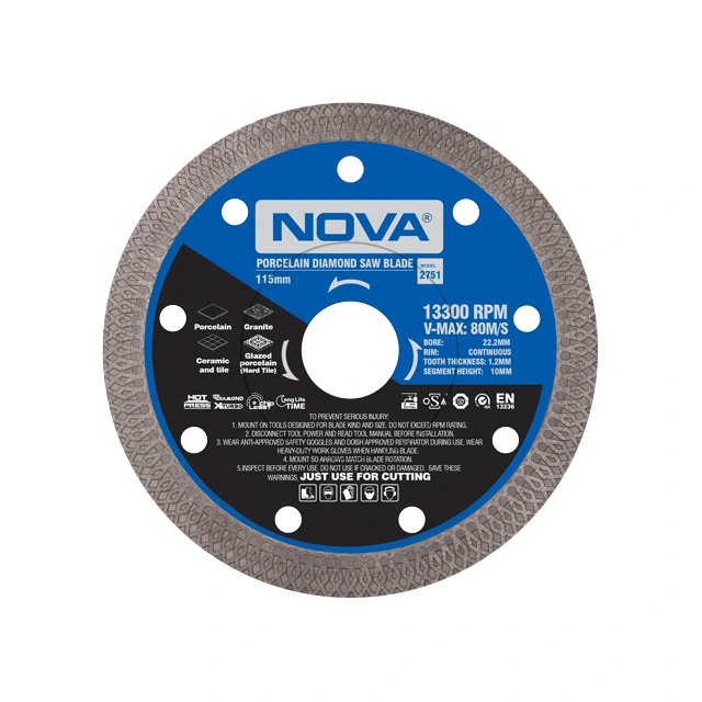 صفحه برش الماسه پرسلان بر توربو 115 میلیمتری نووا مدل 2751، ابزاری تخصصی برای برش دقیق و سریع پرسلان، گرانیت، سرامیک و کاشیهای سخت است. طراحی این صفحه به گونهای است که امکان برش خشک و مستقیم را بدون لبپریدگی فراهم میکند و با بهرهگیری از سگمنتهای توربو مشبک، قدرت برشکاری آن در شرایط پر فشار افزایش یافته است. وجود ذرات الماس با تراکم بالا در لبه این صفحه، استحکام فوقالعاده و طول عمر بالا را برای آن تضمین میکند.
