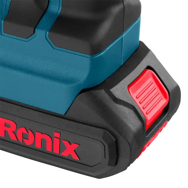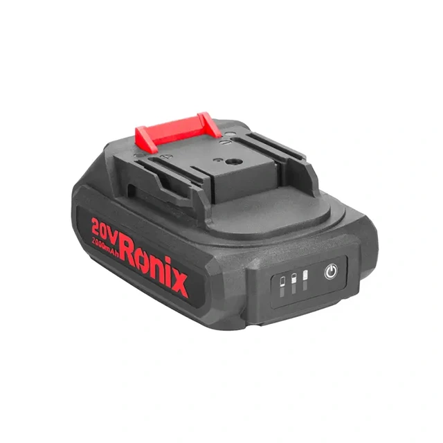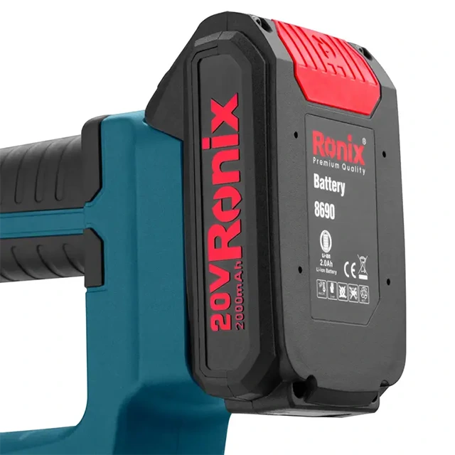 باتری به کار رفته در این میخکوب لیتیوم یونی است که با ولتاژ 20 ولت کار میکند و ظرفیت آن 2000 میلی آمپر ساعت است. این باتری در تمام ابزارهای شارژی 20 ولتی سری 86 رونیکس قابل استفاده است.