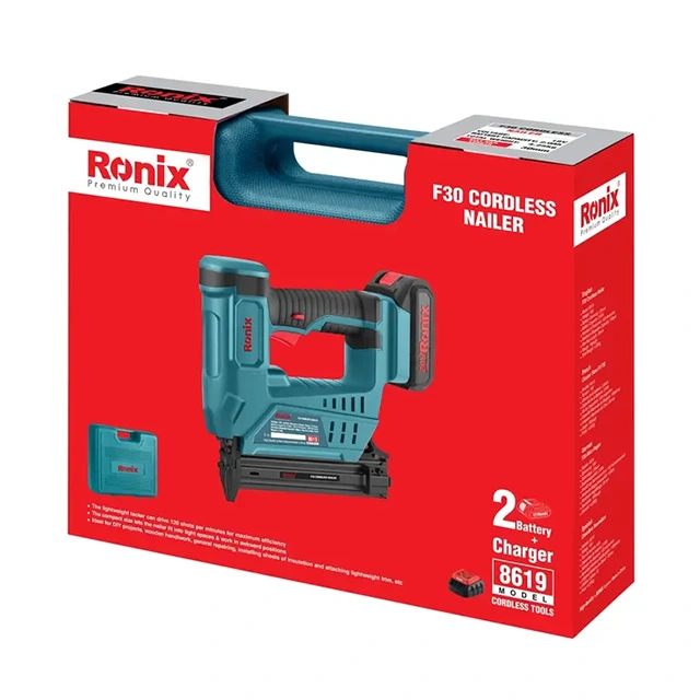 میخکوب شارژی 8619 رونیکس در جعبه رنگی به همراه 2 عدد باتری، 1 شارژر، 1 تیغه، 2 عدد آچار M3 و M4 به بازار عرضه شده است.