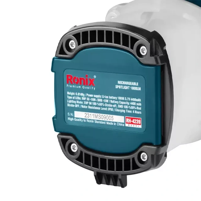 نورافکن شارژی RH-4239 رونیکس با باتری 3,7 ولتی لیتیوم 18650 و ظرفیت 4400 میلیآمپرساعت کار میکند. این ابزار، روشنایی مورد نیاز شما را از طریق لامپهای الایدی SMD و XHP50 تامین میکند. درخشش لامپ SMD این نورافکن، در بازه 500 تا 1000 لومن و لامپ XHP50 آن، 900 تا 1800 لومن است. همچنین، میتوانید میزان روشنایی مورد نظر خود را در حالتهای مختلف تنظیم کنید. در این نورافکن، CCT یا دمای رنگ نور در محدوده 7000-6000 کلوین قرار دارد.
