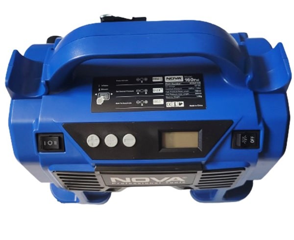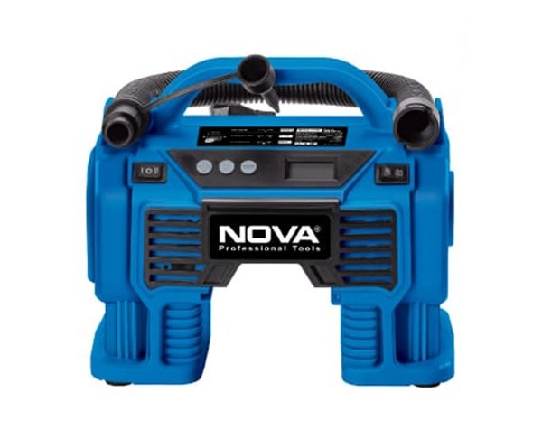 مینی کمپرسور سه کاره فندکی نووا مدلNTA-9160 قابلیت کار با تغذیه برق 12 ولت فندکی خودرو را دارد و ساخت کشور چین می باشد. این وسیله تک سیلندر و قدرتمند با توان تولید فشار هوا تا 160 PSI می باشد. هم چنین دارای سیستم قطع کننده هوشمند و نمایشگر دیجیتال میزان فشار هوا است . این مینی کمپرسور مجهز به LED با امکان استفاده به عنوان چراغ قوه می باشد و دارای طراحی ارگونومیک برای استفاده در مکان ها و شرایط مختلف است. بعلاوه مجهز به لوله خرطومی برای کاربری به عنوان دمنده و بلوور است و دارای انواع نازل جهت باد کردن لاستیک های مختلف است.